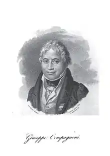 Precisely on the occasion of the first adoption of the green, white and red flag by a sovereign Italian state, the Cispadane Republic, which is dated 7 January 1797 and which was decreed by an assembly held in a hall of the town hall of Reggio Emilia, it was decided that the tricolour cockade, also considered one of the official symbols of the newborn Napoleonic state,[48][49] should have been worn by all citizens.[50] On that occasion, Giuseppe Compagnoni, who is celebrated as the "father of the Italian flag",[51][52][53] proposed the adoption of the Italian flag and cockade.