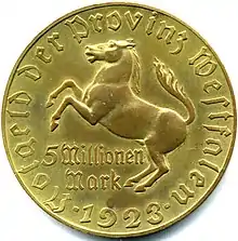 Five million mark coin (Weimar Republic, 1923). Despite its high denomination, this coin's monetary value dropped to a tiny fraction of a US cent by the end of 1923, substantially less than the value of its metallic content.