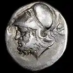 Although many of the first coins illustrated the images of various gods, the first portraiture of actual rulers appears with the coinage of Lycia in the 5th century BC.[44][45] No ruler had dared illustrating his own portrait on coinage until that time.[45] The Achaemenids had been the first to illustrate the person of their king or a hero in a stereotypical manner, showing a bust or the full body but never an actual portrait, on their Sigloi and Daric coinage from c. 500 BC.[45][46][47] A slightly earlier candidate for the first portrait-coin is Themistocles the Athenian general, who became a Governor of Magnesia on the Meander, c. 465–459 BC, for the Achaemenid Empire,[48] although there is some question as to whether his coins may have represented Zeus rather than himself.[49] Themistocles may have been in a unique position in which he could transfer the notion of individual portraiture, already current in the Greek world, and at the same time wield the dynastic power of an Achaemenid dynasty who could issue his own coins and illustrate them as he wished.[50] From the time of Alexander the Great, portraiture of the issuing ruler would then become a standard, generalized, feature of coinage.[45]