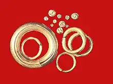 The Piloncitos are tiny engraved gold coins found in the Philippines, along with barter rings, which are gold ring-like ingots. These barter rings are bigger than softballs in size and are made of pure gold from the Archaic period (c.10th to 16th century).[81]