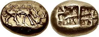A small percentage of early Lydian/Greek coins have a legend.[34] The most ancient inscribed coin known is from nearby Caria. This coin has a Greek legend reading phaenos emi sema[35] interpreted variously as "I am the badge of Phanes", or "I am the sign of light".[36] The Phanes coins are among the earliest of Greek coins; a hemihekte of the issue was found in the foundation deposit of the temple of Artemis at Ephesos (the oldest deposit of electrum coins discovered). One assumption is that Phanes was a mercenary mentioned by Herodotus, another that this coin is associated with the primeval god Phanes or "Phanes" might have been an epithet of the local goddess identified with Artemis. Barclay V. Head found these suggestions unlikely and thought it more probably "the name of some prominent citizen of Ephesus".[37]