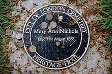 Mary Ann Nichols grave marker at City of London Cemetery and Crematorium, with a number of British pre-decimal and decimal pennies and an American one cent coin left by visitors
