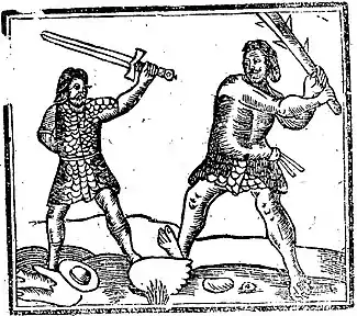 Colbrand (also written Colbron) was a legendary giant from English folklore, supposedly defeated by Guy of Warwick, a legendary English hero of Romance popular in England and France from the 13th to 17th centuries. The story of Sir Guy is considered by scholars to be part of the Matter of England.[1] According to the story, Guy returned to England after some years of absence to deliver Winchester for Athelstan of England from the invading northern kings, Anelaph (Anlaf or Olaf) and Gonelaph, by slaying in single combat their champion, the Danish giant Colbrand.[2]