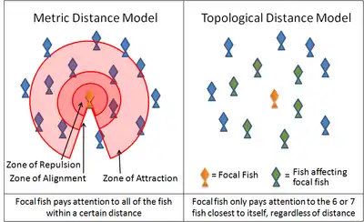 A diagram illustrating the difference between 'metric distance' and 'topological distance' in reference to fish schools
