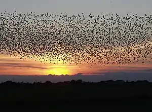 Recent studies of starling flocks have shown, however, that each bird modifies its position relative to the six or seven animals directly surrounding it, no matter how close or how far away those animals are.[42] Interactions between flocking starlings are thus based on a topological rule rather than a metric rule. It remains to be seen whether the same rule can be applied to other animals. Another recent study, based on an analysis of high speed camera footage of flocks above Rome and assuming minimal behavioural rules, has convincingly simulated a number of aspects of flock behaviour.[43][44][45][46]