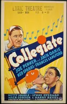 Collegiate is a 1936 American musical film directed by Ralph Murphy and written by Walter DeLeon, Francis Martin and Alice Duer Miller. The film stars Joe Penner, Jack Oakie, Ned Sparks, Frances Langford, Betty Grable and Lynne Overman. The film was released on January 22, 1936, by Paramount Pictures.[1][2][3]