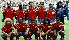 At the 1990 World Cup, Colombia was once again drawn with the Yugoslavs, alongside United Arab Emirates and powerhouse West Germany. Colombia faced the United Arab Emirates at the Stadio Renato Dall'Ara in Bologna, where they won 2–0 with goals from Bernardo Redín and Carlos Valderrama to achieve Colombia's first-ever win at the World Cup finals. Although losing their second game against Yugoslavia 1–0, Colombia achieved qualification to the round of 16 after a historic 1–1 draw with eventual champions West Germany, where Freddy Rincón equalized the game for Colombia in the 93rd minute succeeding West Germany's initial goal in the 88th minute from Pierre Littbarski.[27][28] Thus, Colombia finished the group-stage in third place with 3 points which managed to place them second amongst the third-placed teams. However, Colombia would be eliminated in their next match against Cameroon with a 2–1 defeat in extra time, a match which is remembered for a mistake from Colombian goalkeeper René Higuita and Cameroonian star Roger Milla's iconic goal celebration which was a product of Higuita's mistake.[29][30] Bernardo Redín led Colombia in goal-scoring with two goals against United Arab Emirates and Cameroon. Shortly after this defeat, Maturana left his post as Colombia manager. However, this World Cup appearance marked the rise of a generation known as the first Colombian Golden Generation.[31]