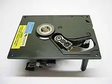 To accommodate the spiral pattern of data, the laser is placed on a mobile mechanism within the disc tray of any CD player. This mechanism typically takes the form of a sled that moves along a rail. The sled can be driven by a worm gear or linear motor. Where a worm gear is used, a second shorter-throw linear motor, in the form of a coil and magnet, makes fine position adjustments to track eccentricities in the disk at high speed. Some CD drives (particularly those manufactured by Philips during the 1980s and early 1990s) use a swing arm similar to that seen on a gramophone. This mechanism allows the laser to read information from the center to the edge of a disc without having to interrupt the spinning of the disc itself.