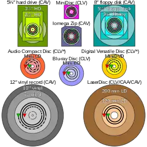 Comparison of several forms of disk storage showing tracks (not to scale); green denotes start and red denotes end.