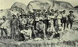 The BSAP served in the Second Boer War of 1899–1902 in its paramilitary capacity, with the newly formed Rhodesia Regiment also taking part, drawing most of its men from the Southern Rhodesia Volunteers. Rhodesia contributed approximately 1,000 men in all,[53] about 20% of the white male population at the time.[54] Rhodesia contributed part of the British garrison at the Battle of the Elands River in August 1900, during which a 500-man force made up principally of Australians and Rhodesians held off attacks from a far larger Boer army under General Koos de la Rey, and repeatedly refused offers of safe passage in return for surrender. Captain "Sandy" Butters, the Rhodesian commanding officer, encouraged his men with shouts towards the Boers that "Rhodesians never surrender!"[55] The Rhodesia Regiment was disbanded later that year, shortly after the relief of Mafeking.[53]