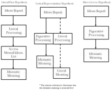 - Contrary to the previous model, the lexical representation hypothesis posits that idioms are stored along with normal words in memory.[5] Idioms are processed both literally and figuratively simultaneously. However, the figurative meaning (lexical representation) of the idiom is accessed first since the word string is stored and processed as one entry. Literal processing consumes more time since it requires the understanding of each word individually. Research conducted to support this hypothesis found that people recognized grammatical idioms as meaningful expressions more quickly than non-idiomatic but grammatical phrases when they were presented out of context.