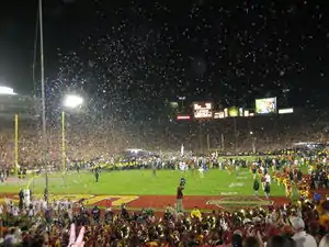 Confetti falls down on the Rose Bowl field after the victory of the Longhorns against the Trojans at the 2006 Rose Bowl, which was played on the Fourth of January, 2006, (NCAA game), part of its post-game celebration.