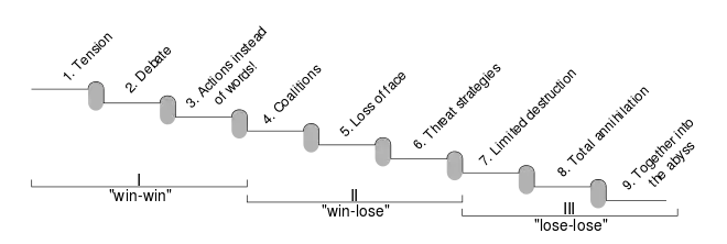 Theorist Andra Medea seeks to explain how individuals, small groups, organizations, families, ethnicities, and even whole nations function when disputes arise between them. She posits that there are four types or levels of conflict, each operating under distinct rules:[22]