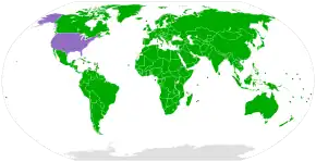 As of 2016, the Convention has 196 Parties, which includes 195 states and the European Union.[10] All UN member states—with the exception of the United States—have ratified the treaty.[11] Non-UN member states that have ratified are the Cook Islands, Niue, and the State of Palestine. The Holy See and the states with limited recognition are non-Parties. The US has signed but not ratified the treaty,[12] because ratification requires a two-thirds majority in the Senate and is blocked by Republican Party senators.[1]