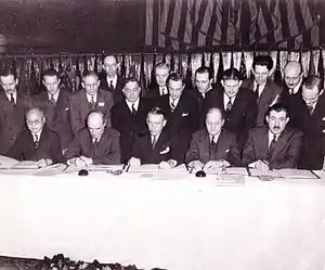 The document was signed on December 7, 1944, in Chicago by 52 signatory states.[3] It received the requisite 26th ratification on March 5, 1947, and went into effect on April 4, 1947, the same date that ICAO came into being. In October of the same year, ICAO became a specialized agency of the United Nations Economic and Social Council (ECOSOC). The convention has since been revised eight times (in 1959, 1963, 1969, 1975, 1980, 1997, 2000 and 2006).[2]