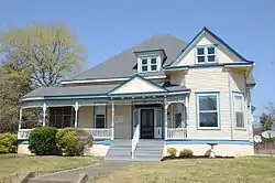The Coolidge House is a historic house at 820 Perry Street in Helena, Arkansas. It is a 1+12-story wood-frame structure, built in 1880 by S. C. Moore as a wedding present for his daughter, Anna Leslie Moore, and Charles Coolidge, Jr. It is an excellent local example of Queen Anne styling, with numerous gables projecting from its steeply hipped and busy roof line. The porch extends partly across the front (south) before wrapping around to the west; it has sawn brackets and a spindled frieze, with a pedimented gable above the stairs.[2]
