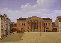 After the fire, it was decided to build a combined city hall and courthouse at Nytorv, at a site previously occupied by the Royal Orphanage built in 1728.[4] The project also included a jailhouse.[5] Christian Frederik Hansen, the leading Danish architect of the time, was charged with the commission. Construction started in 1803 and was completed in 1816. The project was delayed by scarcity of building materials as well as the British bombardment of the city in 1807 in the Battle of Copenhagen. Materials from the demolition of Hirschholm Palace were used for the building.[6]