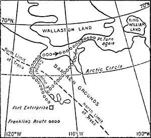 The First Nations guides turned for home as had been agreed, as did Wentzel, leaving Franklin with fifteen voyageurs and his four Britons. Franklin gave orders to those departing that caches of food were to be left on route and that most importantly Fort Enterprise be stocked with a large amount of dried meat. With the lateness of the season the latter point was crucial because Franklin now feared that if, as seemed likely, he failed to reach Repulse Bay, the sea would freeze and prevent him returning to the mouth of the Coppermine River. If so, he would be forced to make a direct return across the Barren Lands, where he and his men would be dependent on whatever food they could forage. There was therefore a real risk that they would be close to starvation by the time they reached Fort Enterprise. Franklin frequently reiterated that well-stocked huts were crucial to their survival.[23]