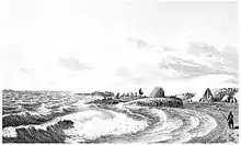 The journey down the Coppermine River took far longer than planned, and Franklin quickly lost faith in his First Nations guides, who in fact knew the area little better than he did, and assured him that the sea was close, then far, then close again. The ice on the rivers and lakes was still firm, and for the first 117 miles (188 km) of the journey the canoes had to be dragged on sledges.[21] The Arctic Ocean was finally sighted on 14 July, shortly before the expedition encountered its first Inuit camp. The Inuit fled, and Franklin's men never had the opportunity to make further contact or trade for supplies as he had hoped.[13] The abandoned camp gave a further indication of the scarcity of food in the area; the stocks of dried salmon were rotting and maggot-infested, and the drying meat consisted mainly of small birds and mice.[22]