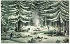 Winter arrived early, game became even scarcer than it had already been, and by 7 September 1821 the expedition's rations were exhausted. Apart from the rare deer they managed to kill, they were reduced to eating barely-nutritious lichens—christened tripe de roche—and the occasional rotting carcass left by packs of wolves. Desperation was such that they even boiled and devoured the leather from their spare boots.[25]