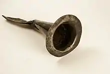 The cornu was originally made from an animal horn and later made from bronze.[7] It was carried around the wearer's neck using a cord.[12] The instrument was curved into spiral shape.[13] 0.5 millimeter thick metal sheets which were likely made from bronze were used to make the spiral shape. The metal would have overlapped each other at the longest sides and were fixed through soldering. Sharp tools or stones would have been used to remove the excesses of the soldering alloys.[14] The spiral was broken up into sectors connected by brass rings which were soldered onto the tubes.[14] Iron curved cores would be used to work wooden pieces around 40 centimeters long to create the curved parts of each tubes.[15] It had a copper and tin bell at the end and it was sometimes made with a cross-brace.[16][17] These ends were connected by a transverse rod that may have been made of wood and was held in place by iron nails. Holes would have been placed at the ends of these rods and would have been used to secure the nails to the bars.[14] The bell was made from a flat sheet of folded metal.[18]