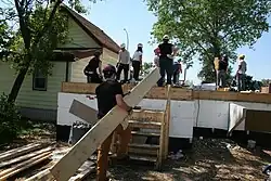 Employees of a leasing firm taking time off their regular jobs to build a house for Habitat for Humanity, a non-profit that builds homes for needy families using volunteers.