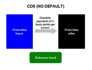 A "credit default swap" (CDS) is a credit derivative contract between two counterparties. The buyer makes periodic payments to the seller, and in return receives a payoff if an underlying financial instrument defaults or experiences a similar credit event.[7][14][18] The CDS may refer to a specified loan or bond obligation of a "reference entity", usually a corporation or government.[15]