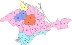 Raions with national status, as of 1938; Crimean Tatar regions in light blue, Russian in pink, Jewish in indigo, German in orange, Ukrainian in yellow