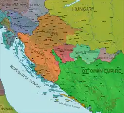 After the conquest of the Byzantine Empire in 1453 the Ottomans quickly expanded westward and also threatened the Kingdom of Croatia.[78] Following the fall of the Kingdom of Bosnia in 1463, King Matthias Corvinus strengthened the defense system by establishing the Banate of Jajce and Banate of Srebrenik. Although the Ottomans had trouble in breaching the defense lines, they regularly conducted plundering raids into Croatia and southern Hungary. During one such raid in 1463 Croatian Ban Pavao Špirančić was captured in Senj.[79] The Ottoman Empire quickly expanded to the southern areas, where they conquered large parts of Herzegovina in 1482 and Croatian strongholds in the Neretva valley.[80]