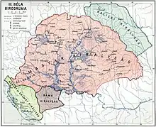 By 1107 King Coloman controlled most of former Byzantine coastal cities in Dalmatia. Since those cities were important, Hungarians and Croats often fought with Venice and the Byzantines for the region.[42] In 1116, after the death of Coloman, Venice attacked the Dalmatian coast, defeated the army of Croatian Ban Cledin and seized Biograd, Split, Trogir, Šibenik, Zadar and several islands. King Stephen II, Coloman's successor, unsuccessfully tried to regain the lost cities in 1117, although the Doge of Venice Ordelafo Faliero was killed in a battle near Zadar. A five-year truce was signed, confirming the status quo. In 1124 Stephen II again attacked the Venetian holdings and regained Biograd, Split, Šibenik and Trogir, but Zadar and the islands remained under Venetian control. However, in 1125 Doge Domenico Michele reconquered those cities and razed Biograd. In 1131 Béla II succeeded to the throne and in 1133 won back the lost cities except Zadar.[43][44] In 1167 a part of Croatia south of Krka River, as well as Bosnia, was conquered by the Byzantines and remained under their control until the death of Emperor Manuel I Komnenos in 1180, when the Byzantine Empire relinquished the acquired lands. After 1180 area under the administration of ban increased, but his domain and scope of activities were not yet fully formulated.[45]