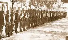 In August 1851, 40 Americans who took part in Narciso López's filibustering Lopez Expedition in Cuba, including the Attorney General's nephew William L. Crittenden, were executed by Spanish authorities in Havana.[33] News of the executions caused a furor in the South, spawning riots in which the Spanish consulate in New Orleans was burned to the ground.[32] In 1854, a secret proposal known as the Ostend Manifesto was devised by U.S. diplomats, interested in adding a slave state to the Union. The Manifesto proposed buying Cuba from Spain for $130 million. If Spain were to reject the offer, the Manifesto implied that, in the name of Manifest Destiny, war would be necessary. When the plans became public, because of one author's vocal enthusiasm for the plan,[34] the manifesto caused a scandal, and was rejected, in part because of objections from anti-slavery campaigners.[35]
