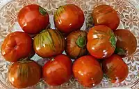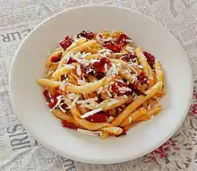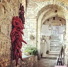 Peperone crusco, a variety of dried bell pepper, is a key element of the regional cooking, so much to be labeled as "the red gold of Basilicata".[7] It is consumed both as a snack and in the preparation of first courses, second courses and appetizers, such as Pasta con i peperoni cruschi, baccalà alla Lucana (salt cod) and acquasale. A very used aromatic element is horseradish, defined by people from Basilicata as "poor man's truffle", historically common on the tables of labourers because of its accessible costs and its wide spreading in the territory.[8] Horseradish is a fundamental ingredient of condiments such as ndruppeche, main courses such as rafanata or by mixing it with bread and potatoes to prepare meatballs, as well as to flavor meat.