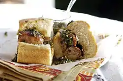 Choripán, Spanish portmanteau for sausage (chorizo) and bread (pan) also called chorizo al pan (sausage on bread), is a sandwich made with barbecued chorizo (that is sliced in half to fit), mayonnaise, ketchup, tomato, lettuce, onions, etc.