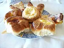 Jesuitas are made with two layers of puff pastry filled with ham and cheese and covered with meringue icing. This is a sweet and salty taste. The same sandwich in Argentina is known as a fosforito.[18][19][20]