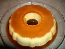• Flan: a kind of rich custard dessert with a layer of soft caramel on top. as opposed to crème brûlée.