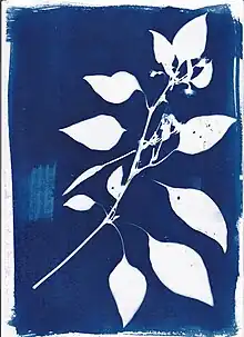 The cyanotype (from Ancient Greek κυάνεος - kuáneos, "dark blue" + τύπος - túpos, "mark, impression, type") is a slow-reacting, economical photographic printing formulation sensitive to a limited near ultraviolet and blue light spectrum, the range 300 nm to 400 nm known as UVA radiation.[1] It produces a cyan-blue print used for art as monochrome imagery applicable on a range of supports, and for reprography in the form of blueprints. For any purpose, the process usually uses two chemicals: ferric ammonium citrate or ferric ammonium oxalate, and potassium ferricyanide, and only water to develop and fix. Announced in 1842, it is still in use.
