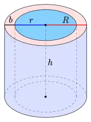 A right circular hollow cylinder (or cylindrical shell) is a three-dimensional region bounded by two right circular cylinders having the same axis and two parallel annular bases perpendicular to the cylinders' common axis, as in the diagram.