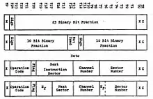 The computer uses a full 24-bit instruction word and data word. Data is represented in one of two fashions, as a 23-bit binary fraction (full word) or as a 10-bit fraction (split word). The two formats are shown in the figure. Instructions also have two formats, either flagged or unflagged as indicated in the figure. A list with all of the available instructions with numeric and mnemonic codes follows. For more information on programming see: