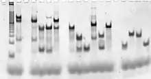 Gel electrophoresis methods, such as this formation assay on a DX complex, are used to ascertain whether the desired structures are forming properly. Each vertical lane contains a series of bands, where each band is characteristic of a particular reaction intermediate.