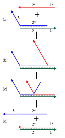 Dynamic DNA nanotechnology often makes use of toehold-mediated strand displacement reactions. In this example, the red strand binds to the single stranded toehold region on the green strand (region 1), and then in a branch migration process across region 2, the blue strand is displaced and freed from the complex. Reactions like these are used to dynamically reconfigure or assemble nucleic acid nanostructures. In addition, the red and blue strands can be used as signals in a molecular logic gate.
