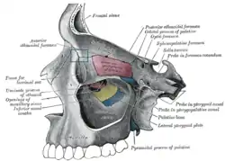 The skull from the front. (Dacryon visible but not labeled. Maxilla is yellow bone in center, frontal bone is light blue bone at top, and lacrimal bone is barely visible pink bone at center. Label for lacrimal bone is at center right.)