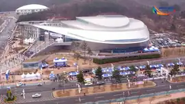 The building has a design motif of "V" (Victory) and primarily serves as an athletics training and competition venue; [3] portable flooring allows the facility to be used for other events such as badminton, volleyball, basketball, and dance sports. [4] The arena is equipped with a 6-lane 200m banked track [5] where the turns are raised to neutralize the centrifugal force of athletes running the curves. This track has no bounce even on the high curves, as is often found in older portable tracks. [1]