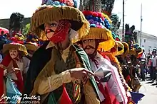 The ruddy hand-painted masks, resemble the appearance of a handsome Spanish character. Some masks have mustaches or beards, others are hairless. The dancers cover their heads with a hat decorated with peacock feathers, laces and other accessories. They also carry a small whip called tajona.