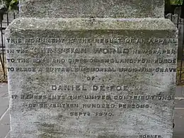 Defoe died on 24 April 1731, probably while in hiding from his creditors. He was often in debtors' prison.[57] The cause of his death was labelled as lethargy, but he probably experienced a stroke.[2] He was interred in Bunhill Fields (today Bunhill Fields Burial and Gardens), just outside the medieval boundaries of the City of London, in what is now the Borough of Islington, where a monument was erected to his memory in 1870.[58] A street in the Bronx, New York is named in his honour (De Foe Place).[59]