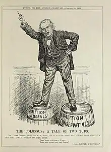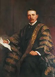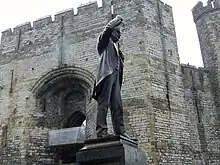He was also a co-leader of Cymru Fydd, a national Welsh party with liberal values with the goals of promoting a "stronger Welsh identity" and establishing a Welsh government.[29][30][31] He hoped that Cymru Fydd would become a force like the Irish National Party. He abandoned this idea after being criticised in Welsh newspapers for bringing about the defeat of the Liberal Party in the 1895 election. In an AGM meeting in Newport on 16 January 1896 of the South Wales Liberal Federation, led by D. A. Thomas, a proposal was made to unite the North and South Liberal Federations with Cymru Fydd to form The Welsh National Federation. This was a proposal which the North Wales Liberal Federation had already agreed to. However, the South Wales Liberal Federation rejected this. According to Lloyd George, he was shouted down by "Newport Englishmen" in the meeting, although the South Wales Argus suggested the poor crowd behaviour came from Lloyd George's supporters.[23][32][33][34] Following difficulty in uniting the Liberal federations along with Cymru Fydd in the South East and thus, difficulty in gaining support for Home Rule for Wales, Lloyd George shifted his focus to improving the socio-economic environment of Wales as part of the United Kingdom and the British Empire. Although Lloyd George considered himself a "Welshman first", he saw the opportunities for Wales within the UK.[23][35]
