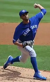 On July 30, 2015, Price was traded to the Toronto Blue Jays for Daniel Norris, Matt Boyd and Jairo Labourt.[29] Price made his debut for the Blue Jays on August 3. He threw 119 pitches in 8 innings, recording 11 strikeouts and a winning decision, while yielding only 3 hits, 2 walks, and 1 earned run in a 5–1 victory over the Minnesota Twins at Rogers Centre. His 11 strikeouts tied José Núñez's team record for most strikeouts in a Blue Jays' pitching debut.[30] On September 5, Price earned his 100th career win, by beating the Baltimore Orioles 5–1.[31] He was scratched from his final start of the season on October 1, as the Blue Jays had clinched the AL East the previous day.[32] Price made 11 starts for the Blue Jays in 2015, and went 9–1 with a 2.30 ERA and 87 strikeouts in 74+13 innings.[10] Price started Game 1 of the ALDS for the Blue Jays, taking the loss and bringing his career postseason record to 1–6. He would earn his second career postseason win on October 12, pitching 3 innings in relief of R. A. Dickey's game 4 start.[10]