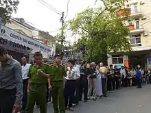 Upon acknowledging Giáp's death, the Vietnamese government announced plans for a national funeral to be held on October 12 and 13. The Funeral Committee consisted of 30 people, headed by General Secretary Nguyễn Phú Trọng.[12] The National Funeral Arrangements Committee, headed by deputy prime minister and Politburo member Nguyễn Xuân Phúc, was tasked with making the arrangements for the funeral and burial ceremonies. Giáp's body was laid in state at the National Funeral Hall, where mourners could pay their respect beginning on October 12. While the main ceremony took place in Hanoi, simultaneous memorials were also held at the Reunification Palace in Ho Chi Minh City and the Provincial People's Committee Office in Quảng Bình, his home province. Immediately after the funeral service on October 13, his body was flown to Quảng Bình, where he was buried in Vũng Chùa - Đảo Yến, a location near the coast.[13] As his resting place is at a remote location, workers had to quickly pave the road to facilitate the burial.[14]
