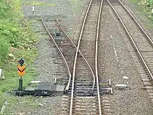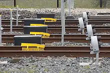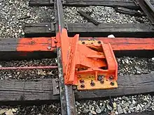 A derail or derailer is a device used to prevent fouling (blocking or compromising) of a rail track (or collision with anything present on the track, such as a person, or a train) by unauthorized movements of trains or unattended rolling stock.[1] The device works by derailing the equipment as it rolls over or through it.