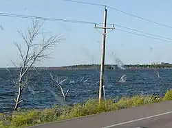 Devils Lake is the endorheic, or closed, lake of a drainage basin of some 3,800 sq mi (9,800 km2), the Devils Lake Basin. The lake collects around 86 percent of the basin's water runoff.[9] Above an elevation of 1,447 ft (441 m) AMSL, the lake spills into neighboring Stump Lake. At 1,458 ft (444 m), the combined lake flows naturally into the Sheyenne River, though the lake has not reached this level in approximately 1,000 years.[10] The Sheyenne River is a tributary to the Red River, which flows into Canada, with eventual exit into the Hudson Bay.[9] Dike protection is set at 1,454 ft (443 m).