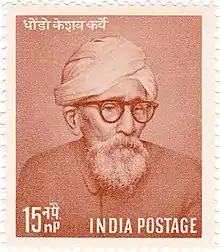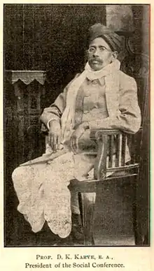 Dhondo Keshav Karve (18 April 1858 – 9 November 1962) (pronunciation), popularly known as Maharshi Karve, was a social reformer in India in the field of women's welfare. He advocated widow remarriage and he himself married a widow. Karve was a pioneer in promoting widows' education. He founded the first women's university in India, the SNDT Women's University in 1916.[1] The Government of India awarded him with the highest civilian award, the Bharat Ratna, in 1958, the year of his 100th birthday. He organized a conference against the practice of devdasi. He started 'Anath balikashram' an orphanage for girls. His intention was to give education to all women and make them stand on their own feet. Through his efforts, the first women university was set up in 20th century.